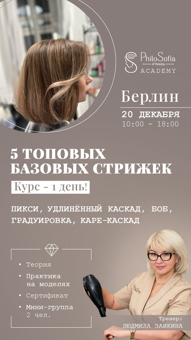 Приглашаем начинающих специалистов и мастеров, желающих повысить квалификацию на профессиональный курс "Пять топовых базовых стрижек".